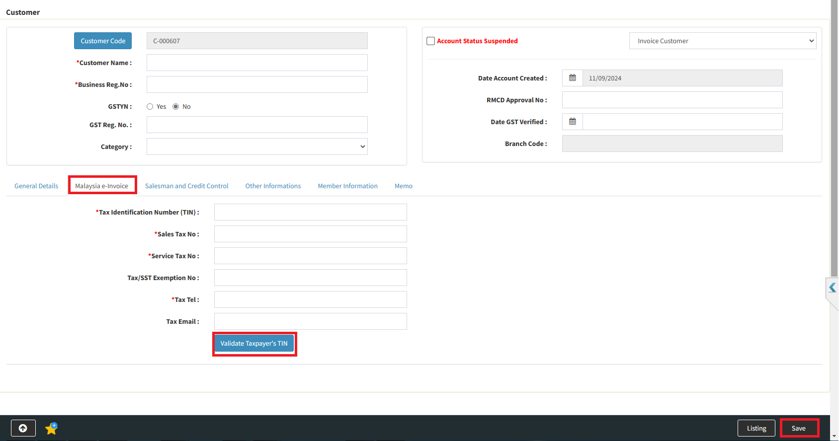 Upon receiving additional customer information, please update those information into offline customer module, and click [Validate Taxpayer’s TIN], and save it will validated update into SKYBIZ system.