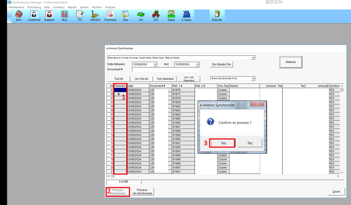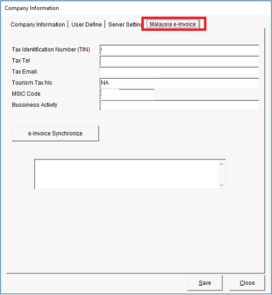 Step 6 :After fill up all the detail (Company Information,Customer Information and Supplier Information), please click [Process Synchronize] to synchronize the document to SKYBIZ cloud, purpose of e-Invoice submission.