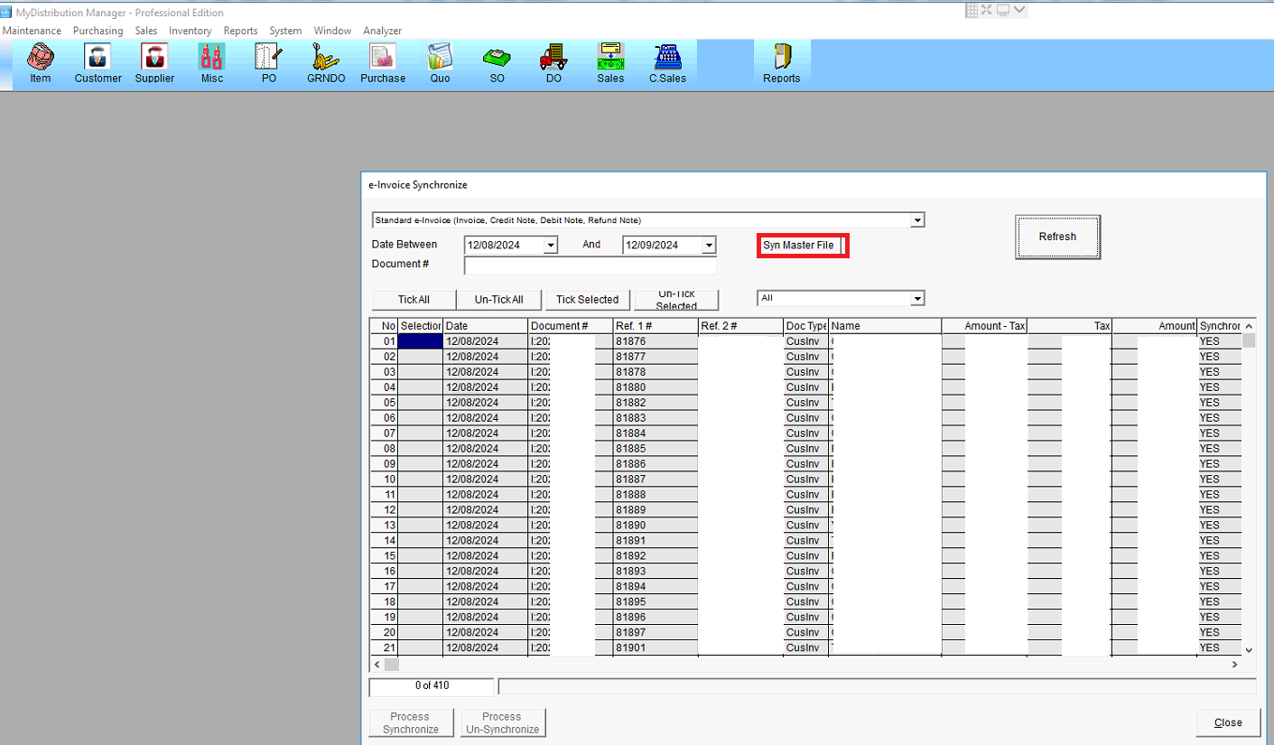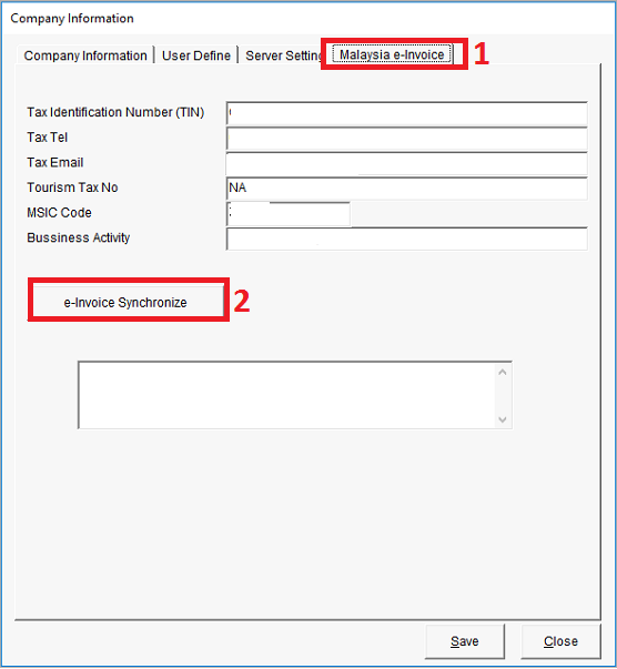 Step 6 :After fill up all the detail (Company Information,Customer Information and Supplier Information), please click [Process Synchronize] to synchronize the document to SKYBIZ cloud, purpose of e-Invoice submission.