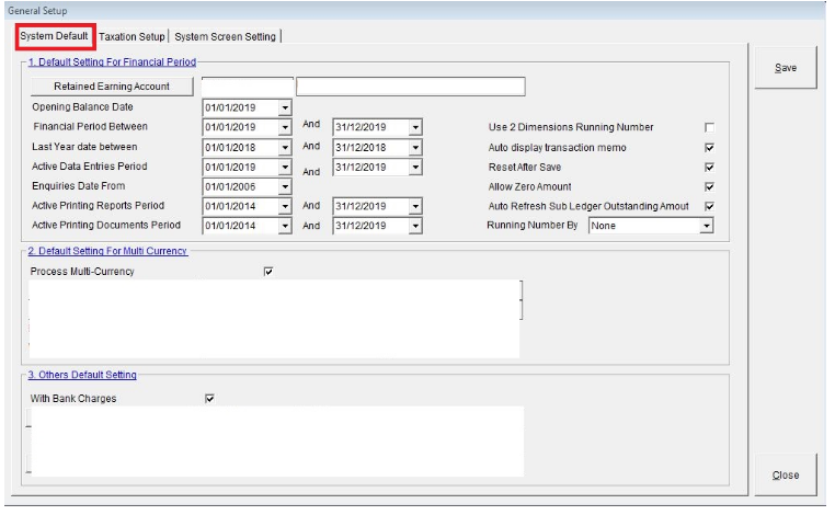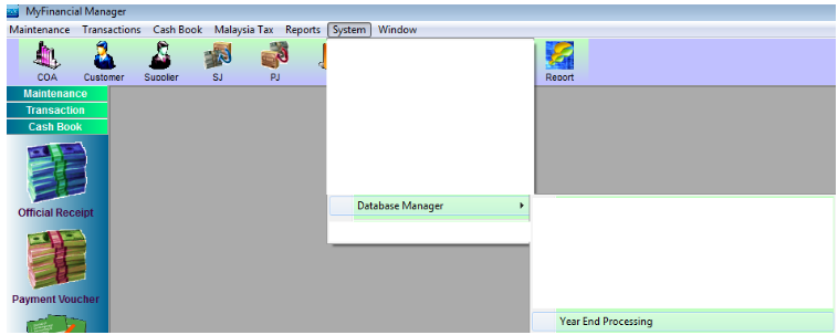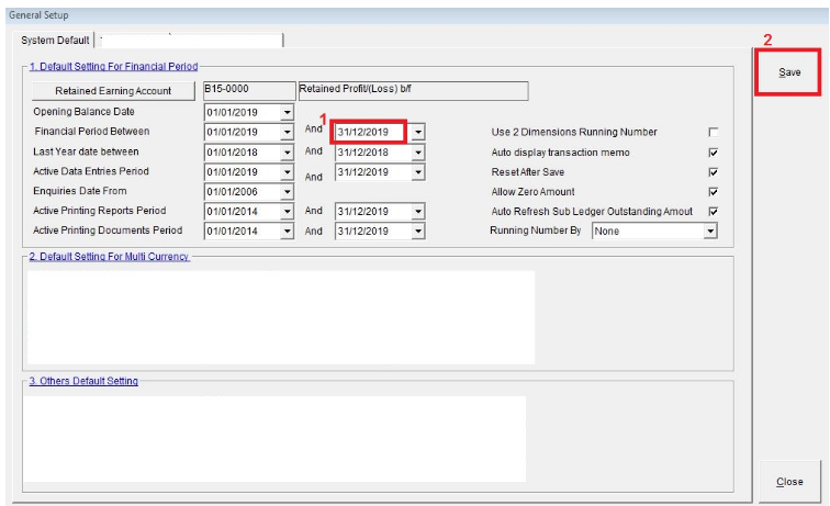 2025-02-21 Financial a) Sign In SkyBiz® Financial b) After that go to System => Administrator Menu => General Setup: c) Then, System Default: d) Next, key in the Change Year End Date: e) And go to System => Database Manager => Year End Processing: f) Follow the guidelines below: Key in the Year End Date: Then, click button Process . g) Add Year End Database and Company Name: