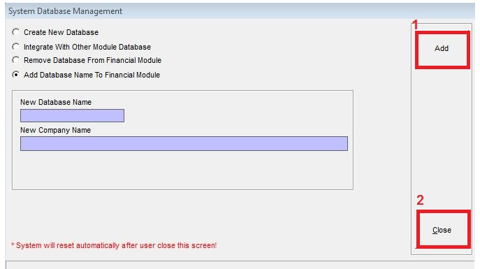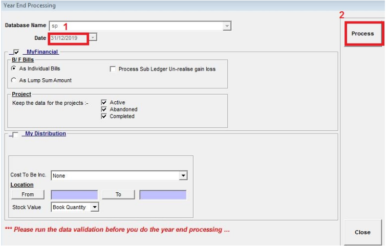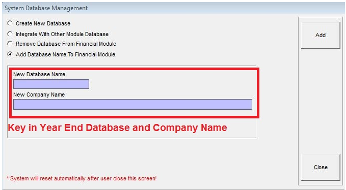 Year End Date Guidelines 2025-02-21 Financial a) Sign In SkyBiz® Financial b) After that go to System => Administrator Menu => General Setup: c) Then, System Default: d) Next, key in the Change Year End Date: e) And go to System => Database Manager => Year End Processing: f) Follow the guidelines below: Key in the Year End Date: Then, click button Process . g) Add Year End Database and Company Name: